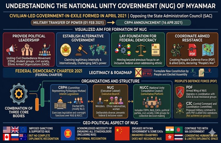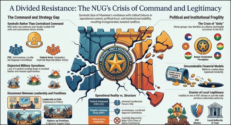 In the present scenario (as of March 2026), the NUG appears to have lost legitimacy and is unable to carry out governance. The anti-MA resistance has fragmented and led to the formation of multiple armed and political groupings, lacking any point of convergence or center of gravity. For the MA, the concerning forces presently are KIA, AA, and KNU, with much resistance from NUG/PDFs except in limited areas along the Indo-Myanmar and Myanmar-Thai borders. The NUG appears to be more of a symbolic or diplomatic actor rather than a government with authority.