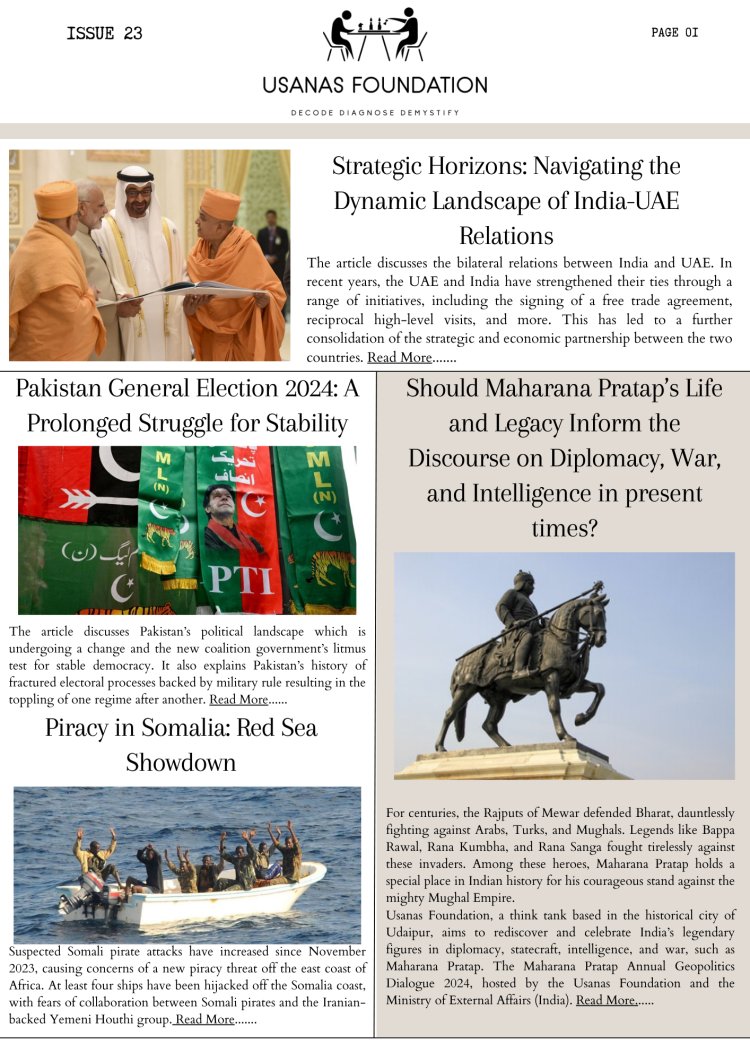 Usanas Foundation is releasing its twenty-third issue of the newsletter for the month of January, February and March. The purpose of this newsletter is to provide you with up-to-date information about the articles that were published and events that were organised by us, this month. As India navigates through the geopolitical complexities of the regional and international environment to establish its credentials as a global player, we continue to remain committed to promoting world peace, prosperity, liberty, and security in a democratic, multicultural world order tolerant of diverse religious beliefs, ideologies, cultures, and lifestyles.